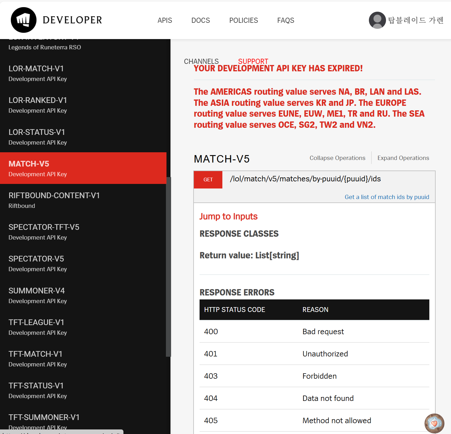 여기서 matchId를 가져와 각 match에 대한 정보를 다른 api에서 불러온다.